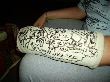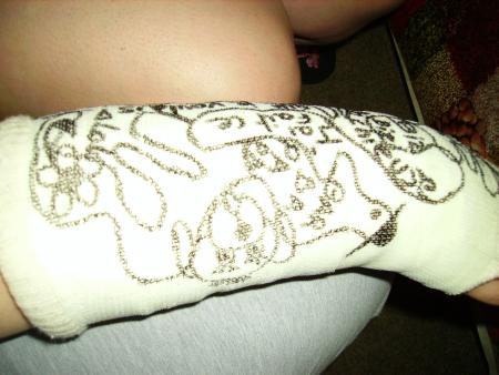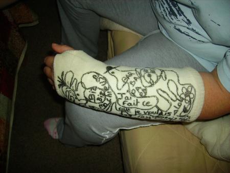 Je vous présente le platre de Sani avec les talents artistiques de Zouzou!!!